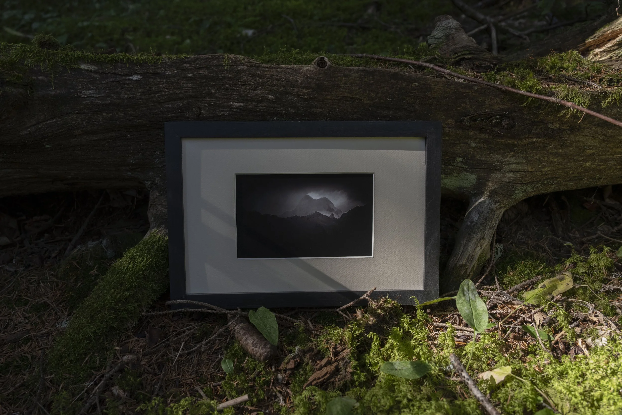 Le bois provient exclusivement des forêts locales d’où sont prises les photographies. En choisissant cette matière vivante et durable, je valorise les ressources de proximité et réduis l’impact environnemental. Mes tirages sont ainsi enracinés dans la montagne, jusque dans leur cadre.
